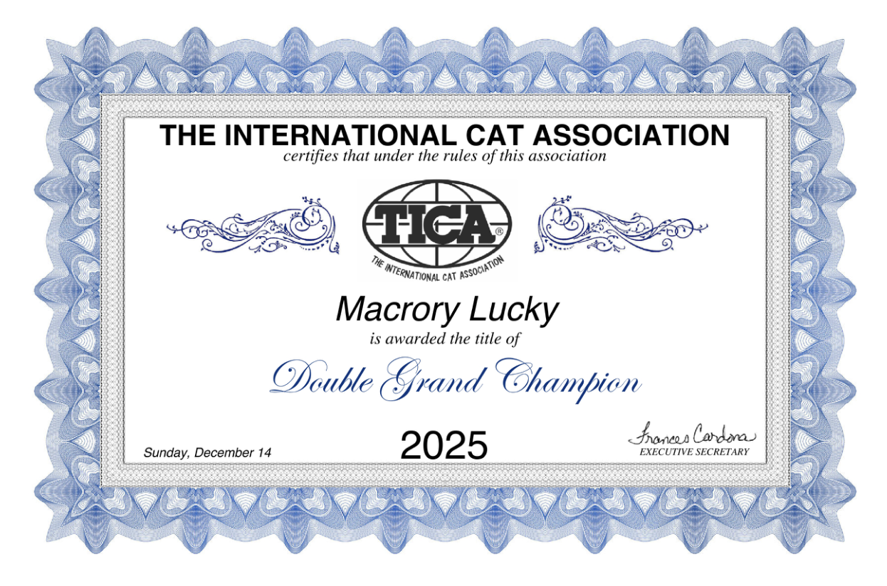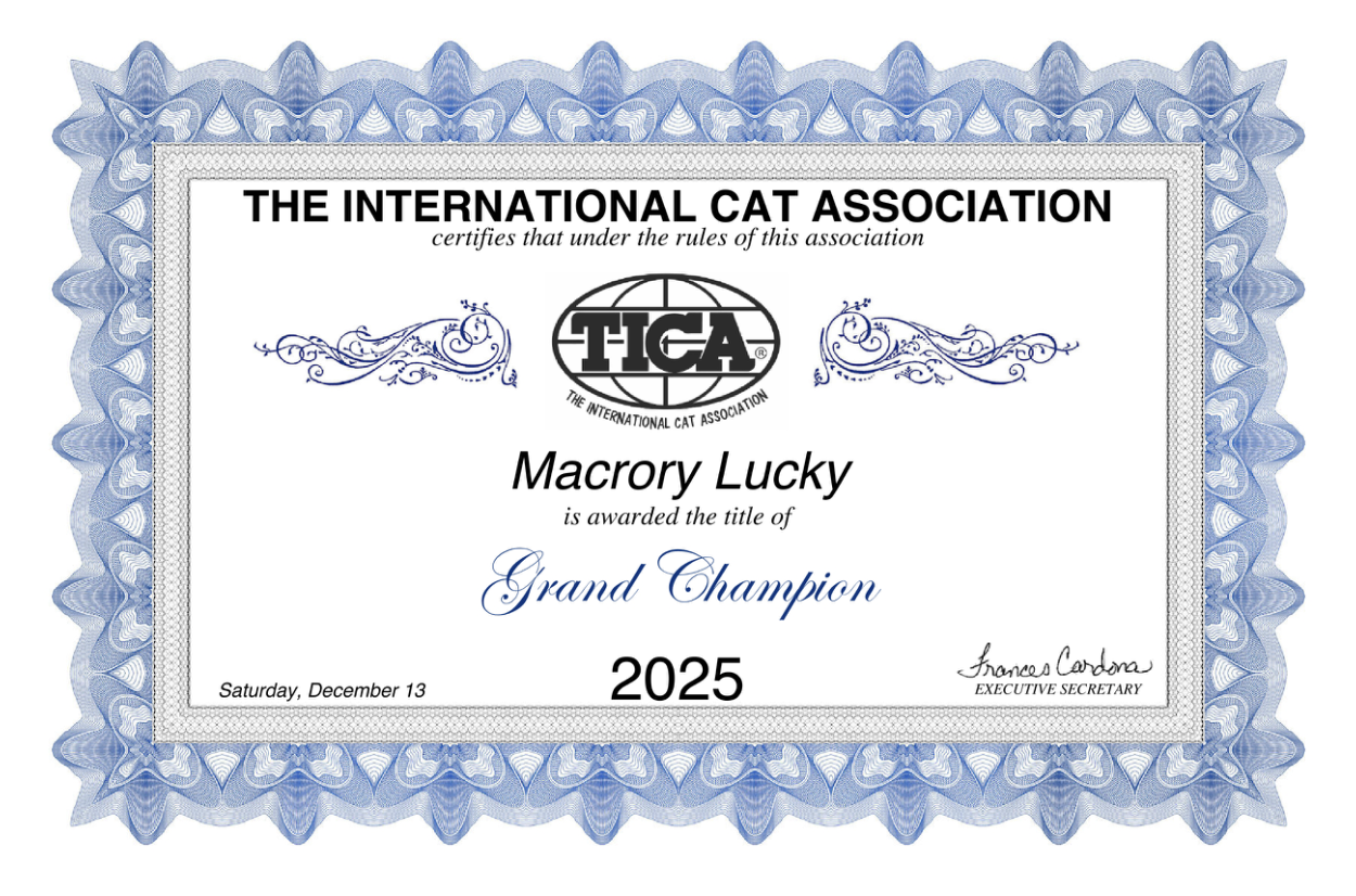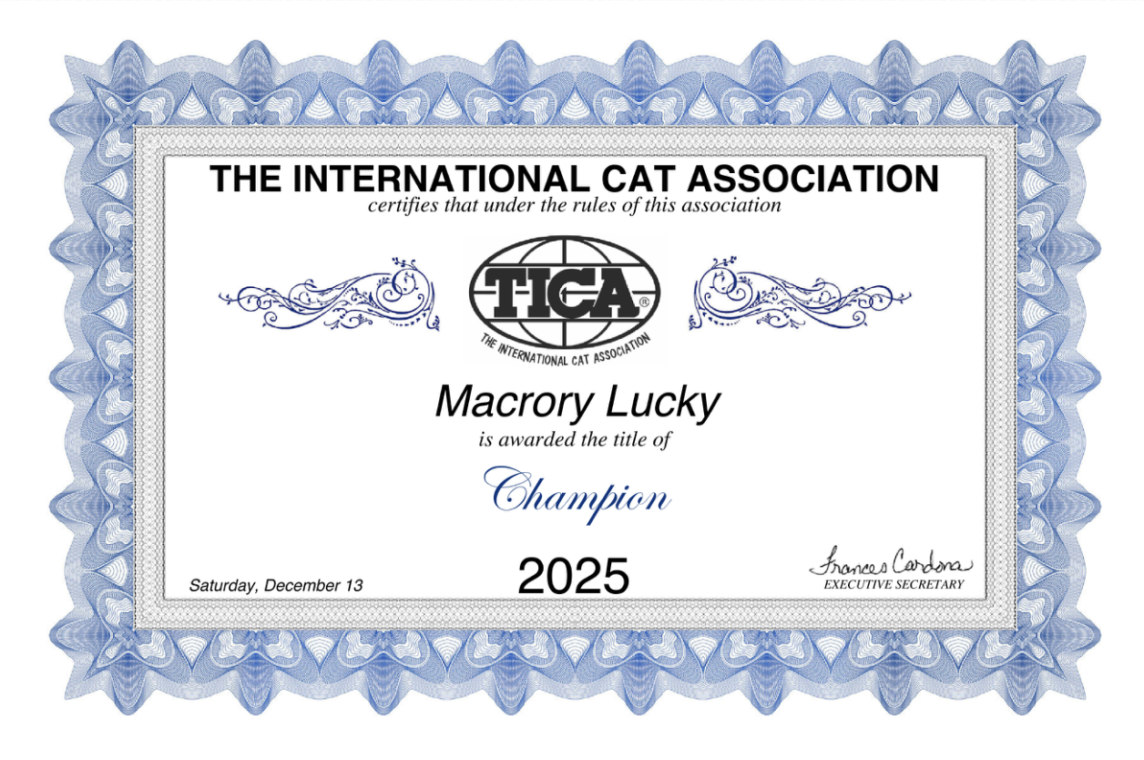 Он очень хорошо начал свою выставочную карьеру как котенок, и он первый, кого мы взяли на Всемирную выставку 2025 в Дрездене — где он стал Лучшим в породе во всех классах!